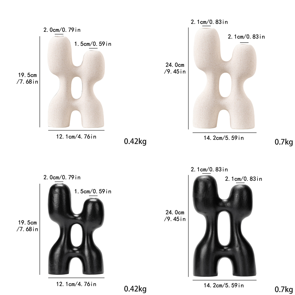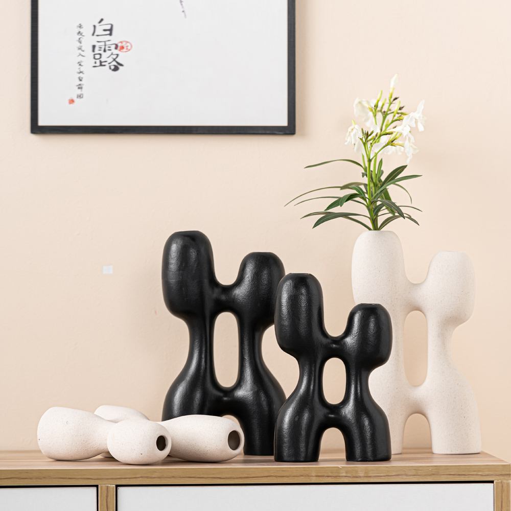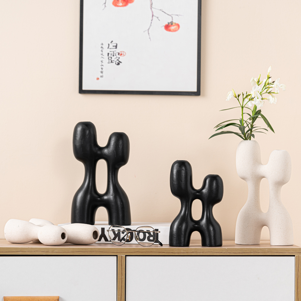 Sleek double – ring ceramic vases with matte finish, blending contemporary art and functionality. Perfect for minimalist spaces or as a bold floral accent—available in black & white duo.