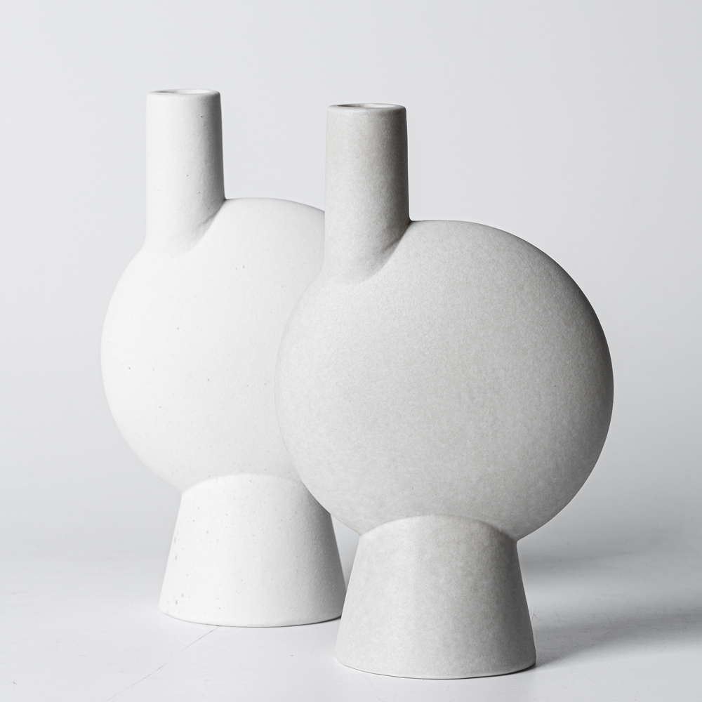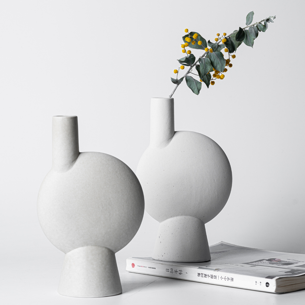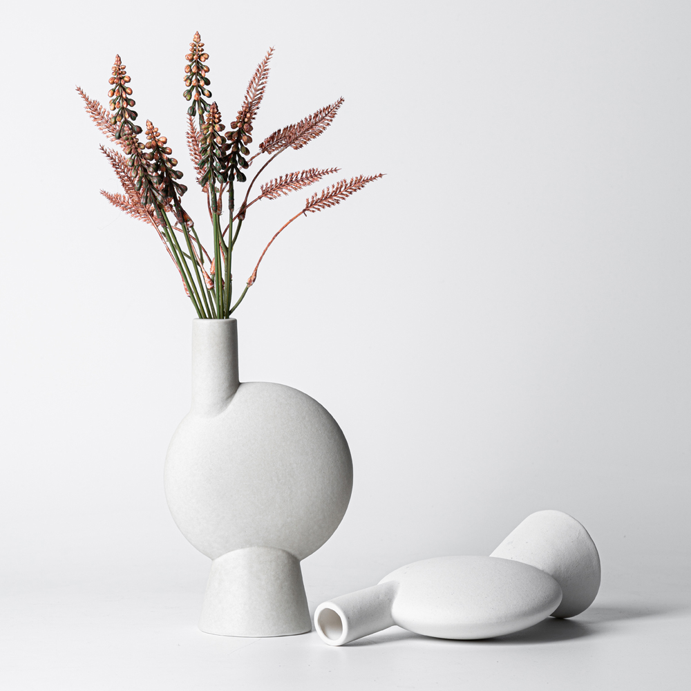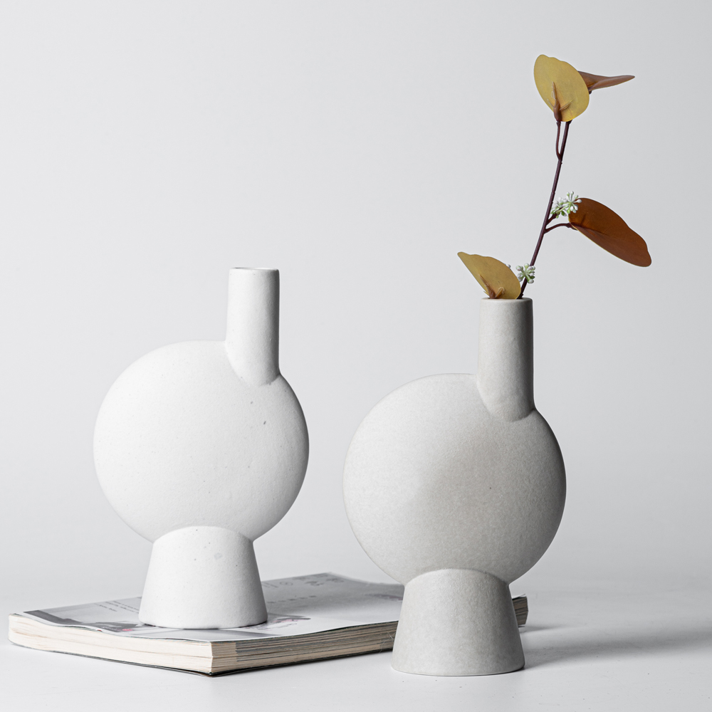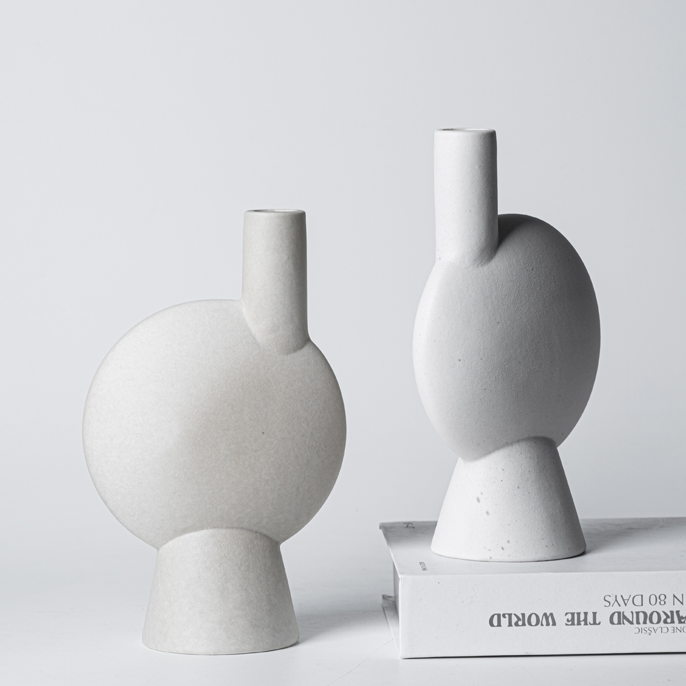 Discover our exquisite pair of minimalist white ceramic vases. Their sleek forms and earthy tones bring a touch of nature indoors. Ideal for showcasing fresh or dried plants, they effortlessly enhance any modern living space with understated elegance.